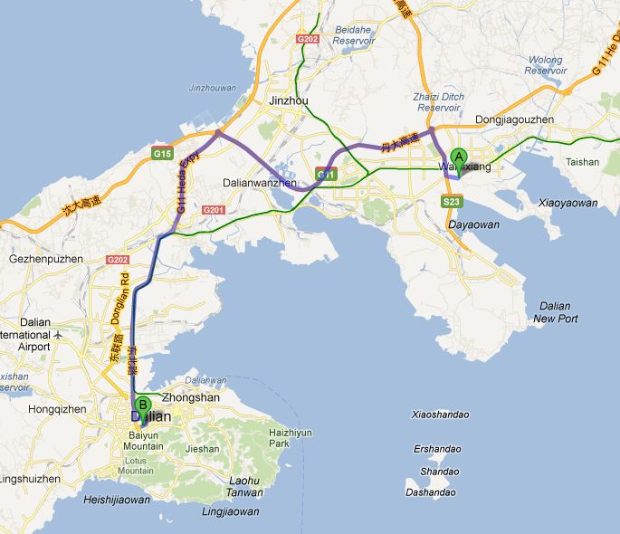 (from http://www.chinatouristmaps.com/travel/liaoning/dalian/dalian-transportations.html) Discoveryland is not shown but it is a bit off this map or a ten-minute bike ride away – the Chinese tacky version of Disneyland. We either walk (20 minutes) or ride our bikes (7 minutes) to the beach before school each morning except when it is too cold to ride then we rug-up and walk.