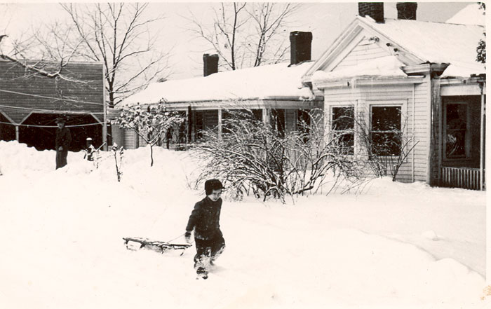 and yes that is my mother reading probably not her email and me siting in the trailer being silly like I was eating raw corn back in the late 1950s. This next photo is of when I first tried to leave Clifton Park, New York. I was about six and I was headed out of town but got as far as the front of the house before getting stuck in a snow drift.