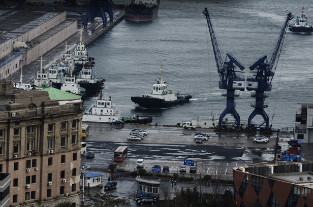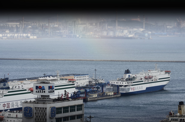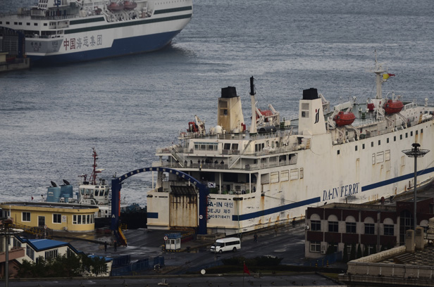 The ferry on the lower right arrived in the morning from South Korea, a 16 hour trip – it looks quite rusty to me.