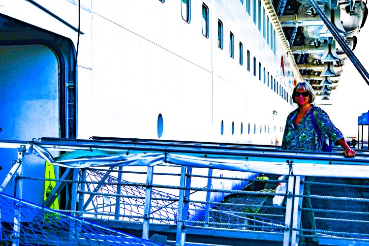 We were up at 5:30. We have lost the ability to sleep. We dragged ourselves, muttering incoherently, to the nearest metro station and off at another station where we wandered aimlessly for way too long in search of Bus # 25 to get our sorry asses to the cruise port. We walked and walked, dragging all our crap with us. No one seemed to know where Bus # 25 did its thing. We even stopped a city bus and asked the driver who did not know. Of course, because we are now on our boat it is obvious we found someone to guide us to Bus #25. Not having done this cruise capper before we were amazed by the size of this boat, which we have been told not to call a boat because it is a ship. People are so thingy about stuff, aren’t they?