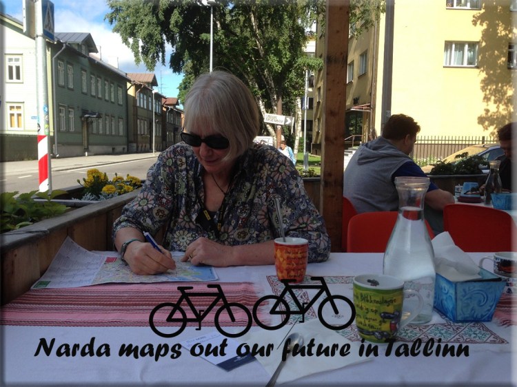 We got a map and were off, riding past all the people lined up at the buses for their tours so they could obediently follow the guide with their umbrella or sign in the air. Some were walking into town, others were lined up at the hop-on-hop-off bus. We proudly rode past them all. We decided not to go to the old town right away but went off into the burbs to live like a local. Stopping at a local wonderful café for coffee for only a euro and a half we enjoyed the beginning of a wonderful day we would be having. There was barely a cloud in the sky at about 19 degrees centigrade. The only thing that separated us from the locals was we had no idea what they were saying in their Estonia-speak and we were drawing lines on our tourist map of all the places we would go. We did not look at the map again for the day so that was a bit of waste though fun planning. Tallinn is quite flat so riding around is easy. People seemed friendly or amused by us – difficult to tell whether people are smiling because they think we are cool or because we are some daft tourists. Nevertheless, we managed to negotiate the place and not get run over. We found our way into the walled town and like all European cities it was old and cool. Built in the 1200s.