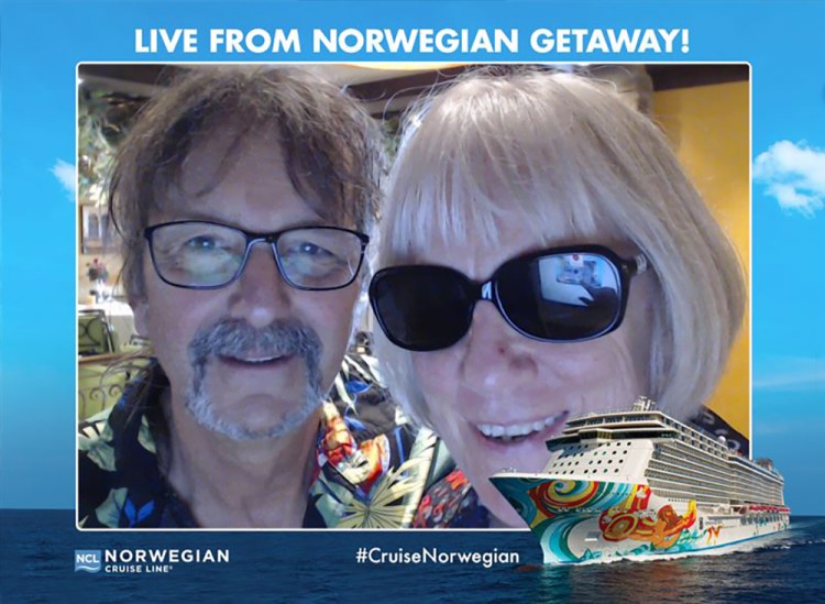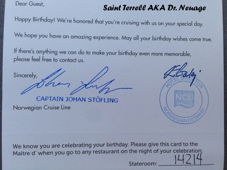 There are ‘professional photographers’ roaming all over. Always wanting to take people’s photos in front of a green screen – hey I do that at home, and I have a new camera (Nikon D7500) so I am not interested but they sure ask a lot. [The camera was from Narda for my birthday, oh so was the cruise – can’t wait to see what she will get me if get to 71]. However, we found machine that took a photo for free and we could Facebook or email it so this was the result. This is a real money making boat – but we managed not to spend any more than what we have for whatever free money we got for signing on to this cruise. We didn’t even have to pay the 18% tip. We had $350 to spend and we spent it on Narda’s daily wine at $10 a shot, some laundry as Narda was tired of doing ‘the smalls’ in the toilet basin; something about it not being classy. What? Saving money is classy to me. Then there was my birthday meal in a ‘specialty restaurant’, a couple of not-included for free Broadway performances and I got a fridge magnet. The only other expense was Narda’s new watch – well that put us way over budget, but hey, we are on holiday. She is very happy with her new watch so be sure to notice it when you see her.