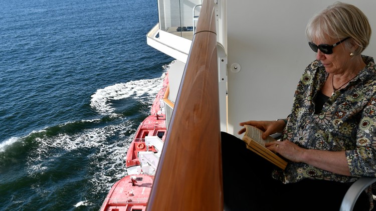 We were happy to be back in the buffet. After dinner, we roamed about. This ship is so large. There is a library though usually full, lots of areas to hangout in, plus the whole upper deck, half of which is for children so we avoid that area. We did not engage in any of the many activities such as ‘movie scores music trivia’, ‘country line dancing’, ‘Latin Rhythms with their DJ’, the video concerts shown on their big screen, and many other game, dances, music stuff. It is fun just to wander about and soak up the atmosphere. Being an American ship (the Norwegian part seems to be the company or driver, not sure how that works out) it was more American than European I think though of course there were people from everywhere. This was the first time this ship had done the Baltic area, usually hanging out in Florida. The entertainment was predominantly American. We loved to sit on our balcony and watch the evening sea.
