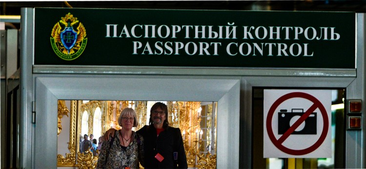I was up at 6 something this morning, Narda was trying the sleeping in routine but my phone alarm went off with Dylan’s ‘Tangled Up in Blue‘, at seven so we dragged our sorry asses down to brekky and off the boat by 7:30. Low and behold there was a glitch in the Russian Immigration computer system, who would believe that? Oops, no photos; that is just so unfair, me, a Yank, first time in Russia and they’re trying to say not to take pics. Well stuff them, I took heaps. Videos too. Sorry – couldn’t resist embedding us into the door. The rest is real news though and an actual photo taken in a restricted zone – whoopee.