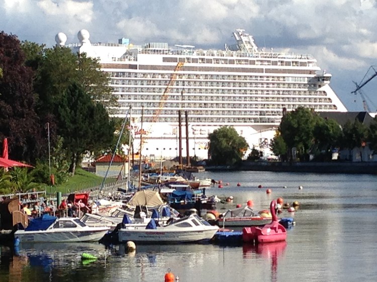 It is a lively area with the swimming pool, main stage, and today being a sea day; we left last night at ten and get to Tallinn tomorrow morning, everyone is just everywhere. We spoke to our boat-neighbour who we ran into on our walk this morning about house exchanges. They are from England and I think one of them has a house in Spain so we are hoping we can get some more home exchanges on this trip. We have one for Berlin next September and need a couple more of a month each to make flying to this area worthwhile. This is what retirement is about; forgetting what happened the day before and planning for the next trip. Saying that I remember what we did yesterday afternoon, we went into Warnemünde for a wander. A nice seaside town. A lot of people had gone for a tour to Berlin and other German like towns but we wanted to immerse ourselves into the cruise experience, sleep and eat, and we did not think we could just walk off the boat whenever we wanted to. But by five pm we were a tad bit bored and wanted to go out. It was all very easy, just showed our room card and went for a couple of hours walk. There were two other large ships behind us and hoped the people aboard were not envious of our larger and newer vessel.