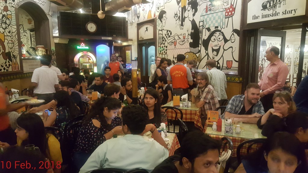 A little-known fact is that Cafe Mondegar is the first restaurant in Mumbai to house a jukebox. It was started in 1932 by Iranian Zoroastrians as an Irani café but now is a hipster’s hangout (proof being that Narda and I ate there, twice). The jukebox is not from the Zoroastrians but was installed in ‘the mid nineteenth century’ a more exact date is not given but apparently the place was modernized and made groovy in the 1980s and 1990s. There are great cartoons on the walls and ceiling – from a famous Indian artist, Mario Miranda, who made the murals for the café.
