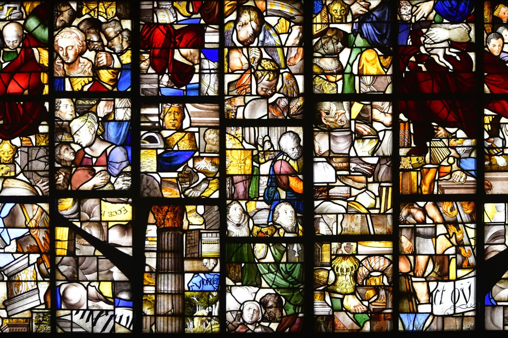 In our Utrecht clip there are a few minutes of organ music as well as shots from inside this beautiful building. Included with the entrance fee of about six Euros is a listening device which very clearly explains the many huge stained-glass windows – one of the better information deliveries I have found at any museum. Plan to spend at least an hour here to get the low down on all the capers that went on in this neck of the woods. Wikipedia has lots about it over at https://en.wikipedia.org/wiki/Sint_Janskerk and if you want to jump to see just the stained-glass trip hop over to https://en.wikipedia.org/wiki/Sint_Janskerk. My suggestion is to just watch our video – https://www.youtube.com/watch?v=fBJhZgMqB6A . Better yet check out their page http://www.sintjan.com/ with great photos and stories told. There are many windows like the one below.