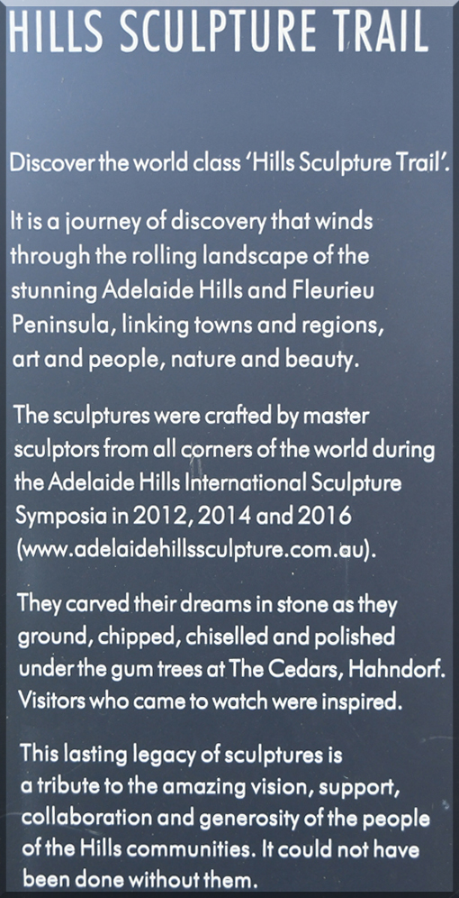 The sculptures are crafted by master sculptors from around the world every two years. The last one was in 2017 and the next is schedule for April 2019. Over nine days nine sculptors will be doing their stuff. We leave for the States mid-April and will depend on you to tell us about it and share photos. (don’t let us down) Other towns throughout the Adelaide Hills will be doing this too. In 2017 there were 26 sculptures done. Find out more at http://hillssculpturetrail.com.au/