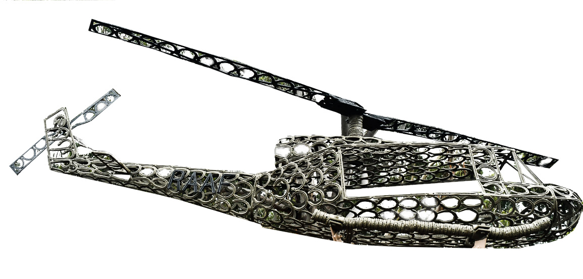“RAR Somalia Veteran, Greg Hopgood, unveiled his Huey made with nearly a ton of horse shoes. Commissioned by the Mt Barker District Council for the 100th Anniversary at the end of WW1. Using a 112-year old-hand-cranked coke forge, he carefully sculptured and created the Iroquois helicopter, commonly known as a “Huey”, which is synonymous with the Vietnam War.”