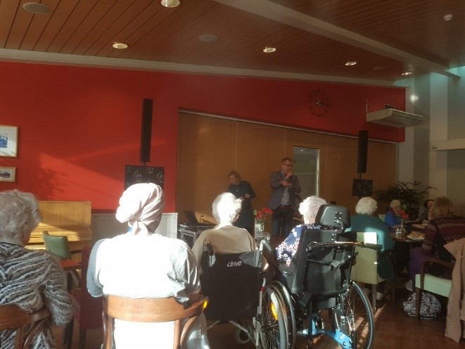 Then the longish drive to Utrecht where we met cousins, Hans and Mirjam at Ineke’s old age home. The home is pretty nice, divided into small cells of folks who live, cook and hang out together like families. It’s very nicely set up. Hans and Mirjam where singing for the residents in a concert/sing along. They are great. They have a really professional set up and do this regularly. Enjoyed by all….Ineke seems happy in her life there. We joined Hans and Mirjam for some great conversation (with the girls, Linda and Suzanne) over beer and Chinese takeaway.