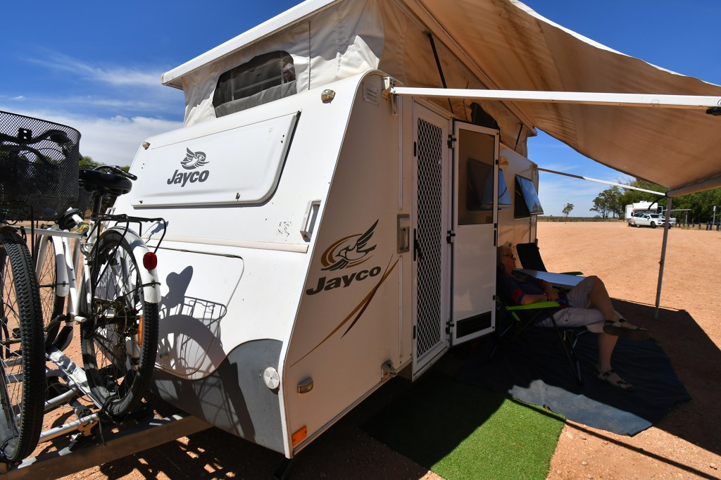 The Poplars Caravan Park is a bit feral, a few long-term stayers, a bit of rubbish and car parts and ‘bogans’ around the place. At $30 per night it is cheap. The toilet blocks are a bit gross, the owner a loud opinionated character; “I loved America, the only problem is that it is full of Americans”. Narda has some quotes in her piece above. However, we did not mind, it is across the street from a shopping centre with Coles and Target and two blocks from the main street where we got take-away Chinese food our first night. There is a good bike trail along the Macquarie River taking us to the zoo and further if we were less lazy. The caravan park gets a one- and two-star rating on the Internet. We found it all quite convenient and quiet enough for a stay.