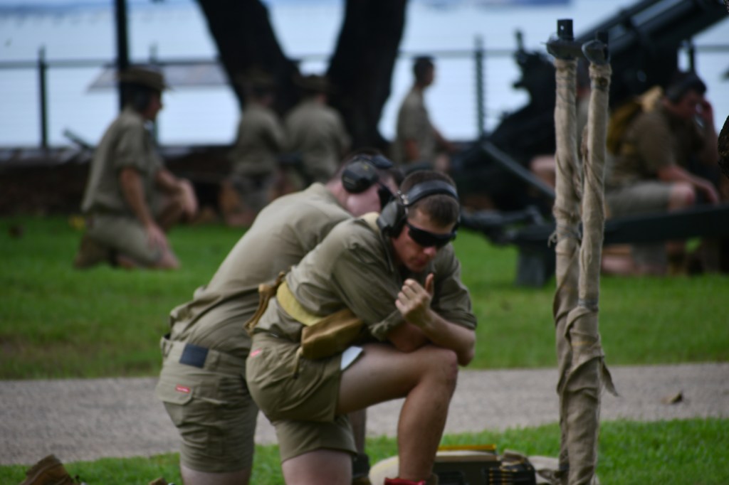The band of the 1st Brigade played, wreaths were laid, the last post was played, and notable people spoke. It was very moving. Then the air raid sounded sirens and a jet flew over, real loud, real close. The gunners shot rounds into the sea. Cosmetic smoke whirled around us.