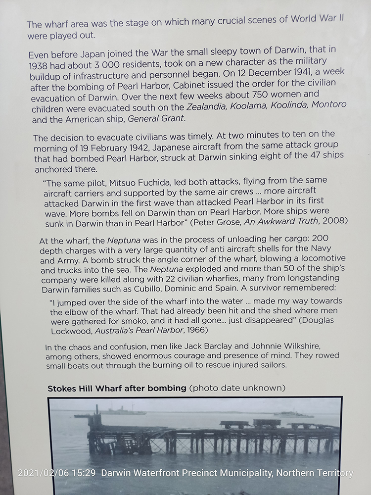 Here we are day 3 in Darwin. Day one we spent bits of the afternoon after arriving getting caught up on sleep and viewing the city from the roof of our building. Darwin CBD is small we walk it all in fifteen minutes. There is a mall and a shopping centre with a Coles supermarket ten-minutes away and a Woolworths supermarket eleven-minutes away. Fifteen-minute walk is the Darwin Waterfront Precinct a cool area with lots of restaurants and shops and Stokes Hill Wharf where cruise ships would come in if it were not for Covid-19. I have lived in Hawaii (1969 – 1971 / 1980 – 1981) as well as a few visits. I took my parents to Pearl Harbor and thought I knew lots of stuff. But until yesterday I did not know that more aircraft attacked Darwin than attacked Pearl Harbor. More bombs fell on Darwin than on Pearl Harbor. More ships were sunk in Darwin. On 19 February 1942 Darwin was bombed. We watched folks setting up a huge tent for the memorial in ten-days 19th February. A lot going on here in the next couple of weeks.