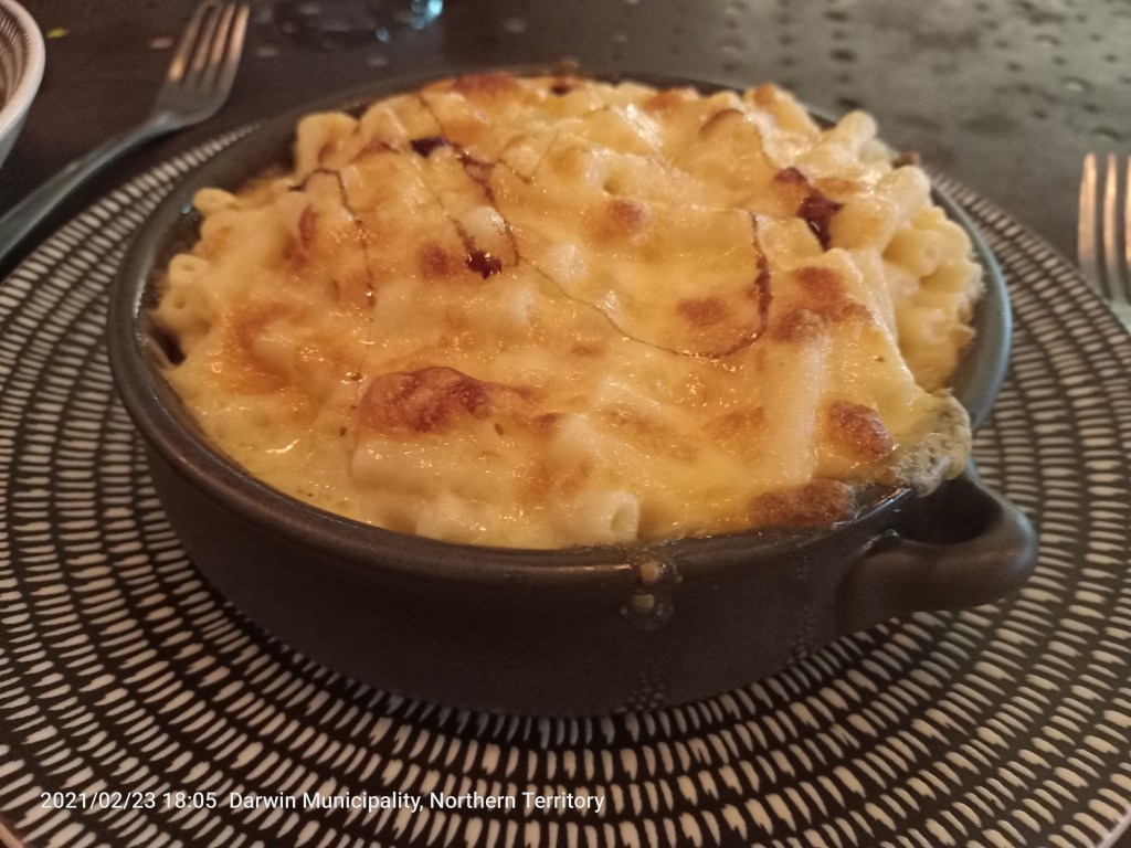 Not being able to spend 67% of my life in the pool I try to control my diet. However, last night we decided to go out for dinner. Mitchell Street, ten minutes from our hotel, is a hub for restaurants. We go there most mornings, to McDonalds of all places, but that is because we get senior’s coffee – the second cup is free, and they do make good latte. I had it in my mind that I wanted a meal of mac & cheese – for the first one of 2021. I don’t think I had any in 2020 – but that was a bit of an unusual year anyway wasn’t it? We looked at heaps of places and no one was offering such godly tastes. We needed to find one that catered to Yanks. It is in the news that ‘Thousands of US marines to touch down in Darwin before June 2021’ (arriving in batches of 200-500 marines) – probably to find a good mac and cheese. Knowing that heaps of the critters are already roaming the streets of Darwin was a good piece of information. There must be a place that panders to the American palate. And there was. Six Tanks, a micro-brewery bar was our nirvana.