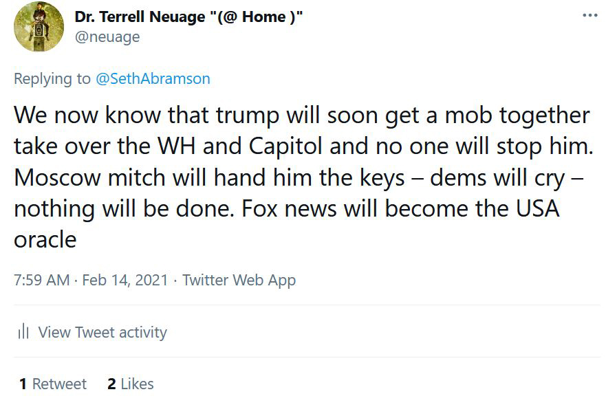 I get up at five every morning watching the impeachment trial – always knowing the result. I want to sleep in – I am on holiday – well, being 73 and retired, every day is a holiday. But I am somewhere else, Darwin, we can only travel in Australia. Now even our home state South Australia is locking out our neighbouring state of Victoria for a week due to covid – 14 new cases in the whole state and the rest of the country locks their doors. More than one-hundred thousand new cases in the USA so far today – a few days ago there were more than two-hundred thousand in a day – 4,500 dead whereas in Australia no new deaths – there have not been any deaths for a long time. Happily, this is the end of the so-called impeachment trial. They just voted 57 – 43 so he is guilty but not guilty enough. What can I do? Millions of people worldwide are upset. I have given up on America and I am an American. My big protest I dumped on to Twitter.