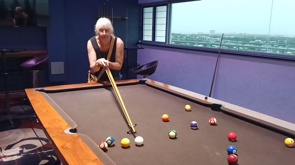 One of our evening past times was playing pool on the fifteenth floor. Narda beat me every time – not quite sure why. I think I used to be quite good.