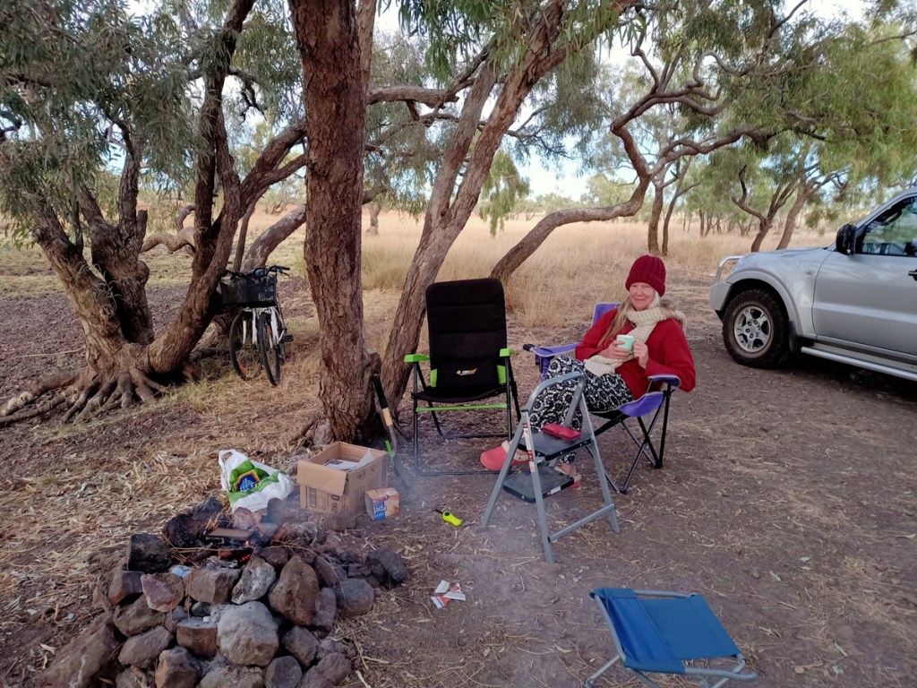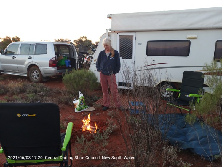 Overnight free camping alongside highway 100 Ks west of Wilcannia – arrived 4.45 pm – made a campfire to stay warm – 3 degrees Celsius – 37 degrees in Yank speak.