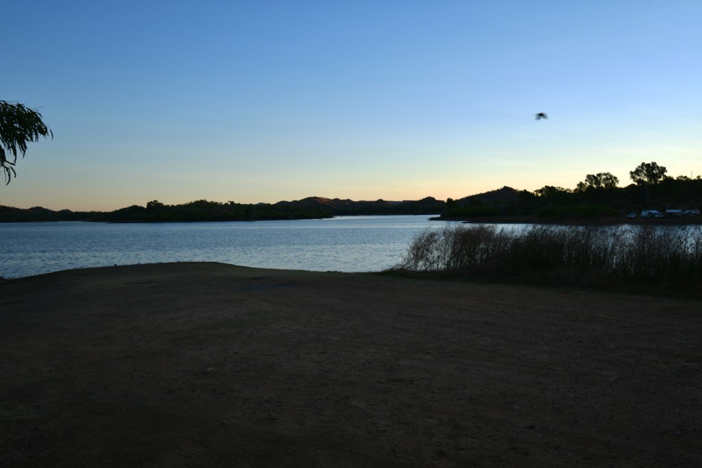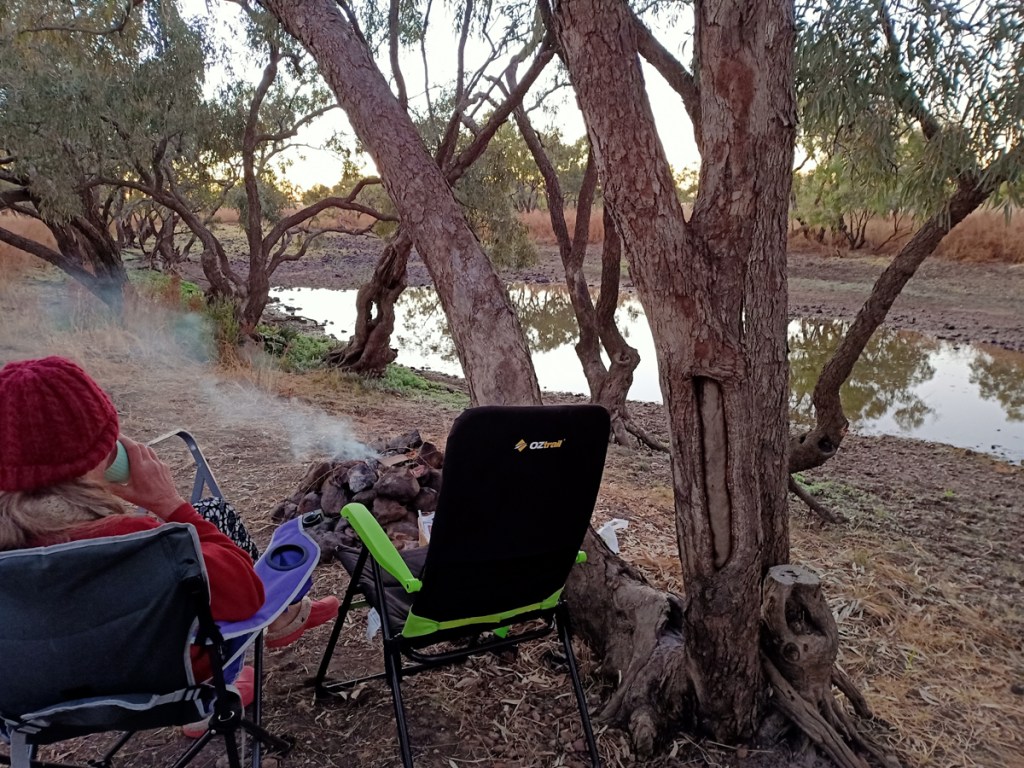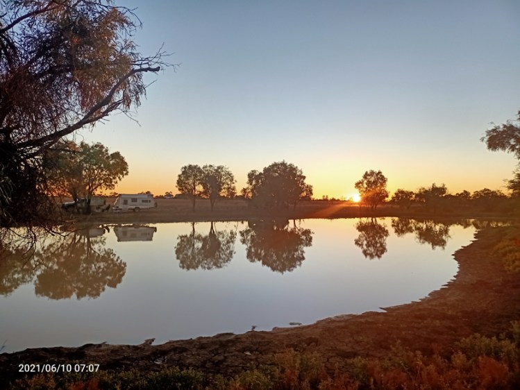 Lured by the prospect of another free site, we braved the corrugated road for 2 Kms. It was beautiful, on the banks of “The Long Waterhole”, of course all the water side spots were already taken by fellow tight-arses, but we had a beautiful sunrise.