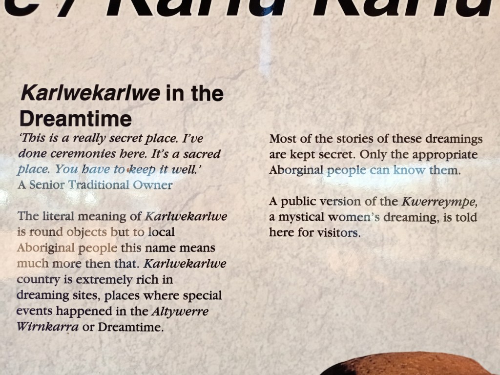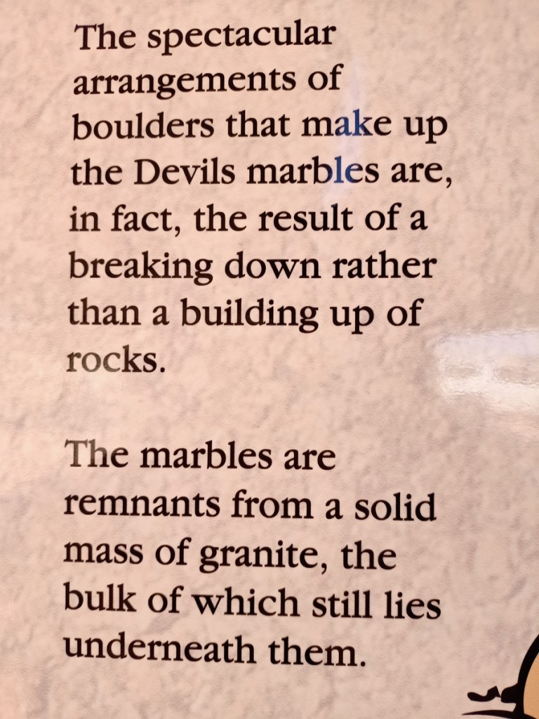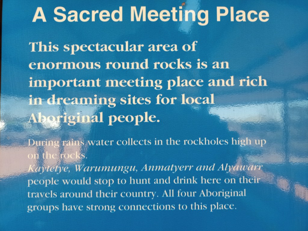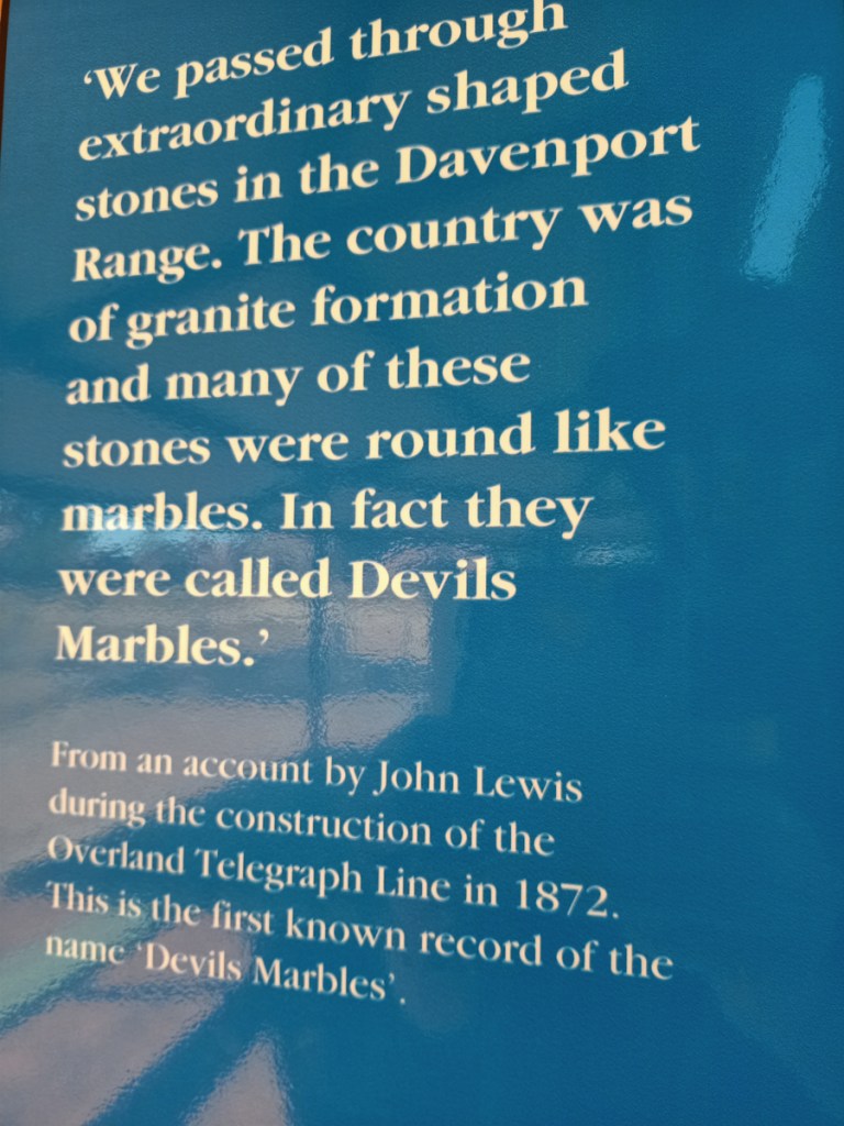 Karlu Karlu / Devils Marbles Conservation Reserve is a protected area in the Northern Territory of Australia located in the locality of Warumungu about 105 km south of Tennant Creek, and 393 km north of Alice Springs. the Devils Marble are important to the local Warumungu, Kaytetye, Alyawarra, and Warlpiri people who live in the traditional country that surrounds them