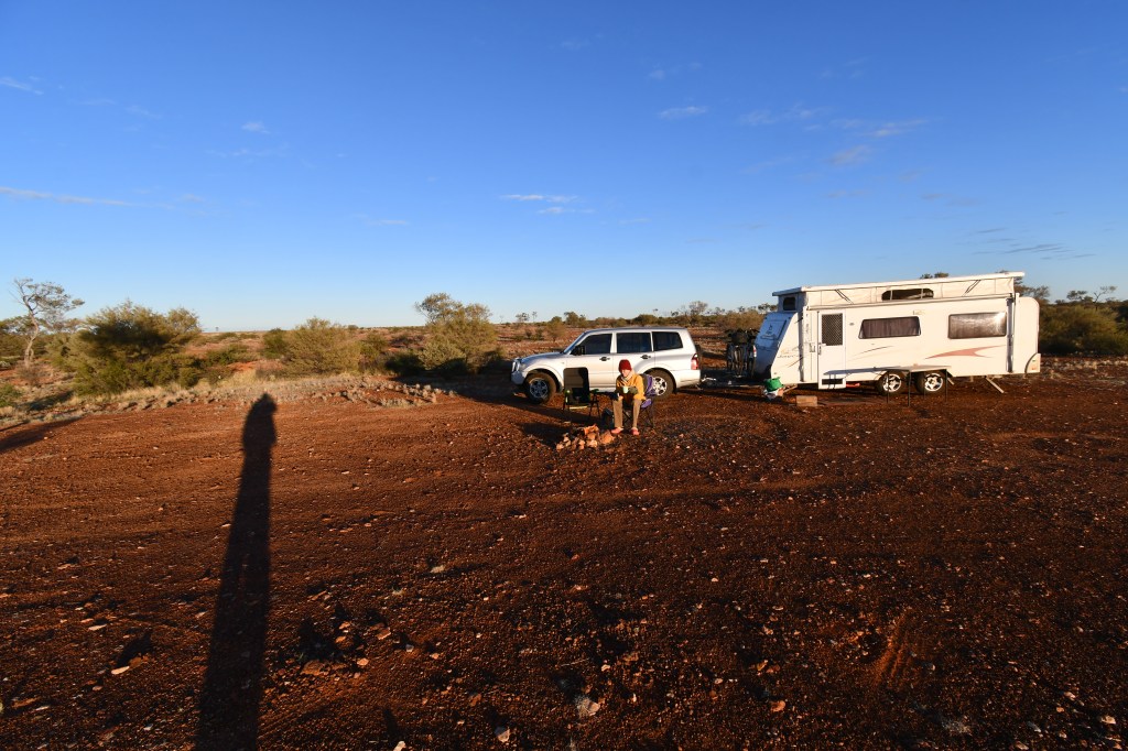 Our first free camp. The road consists mainly of caravaners. Quite incredible, I think 2 out of 3. The road trains continue on their way oblivious, causing my extended side mirror to flatten against the car each time they whoosh by.