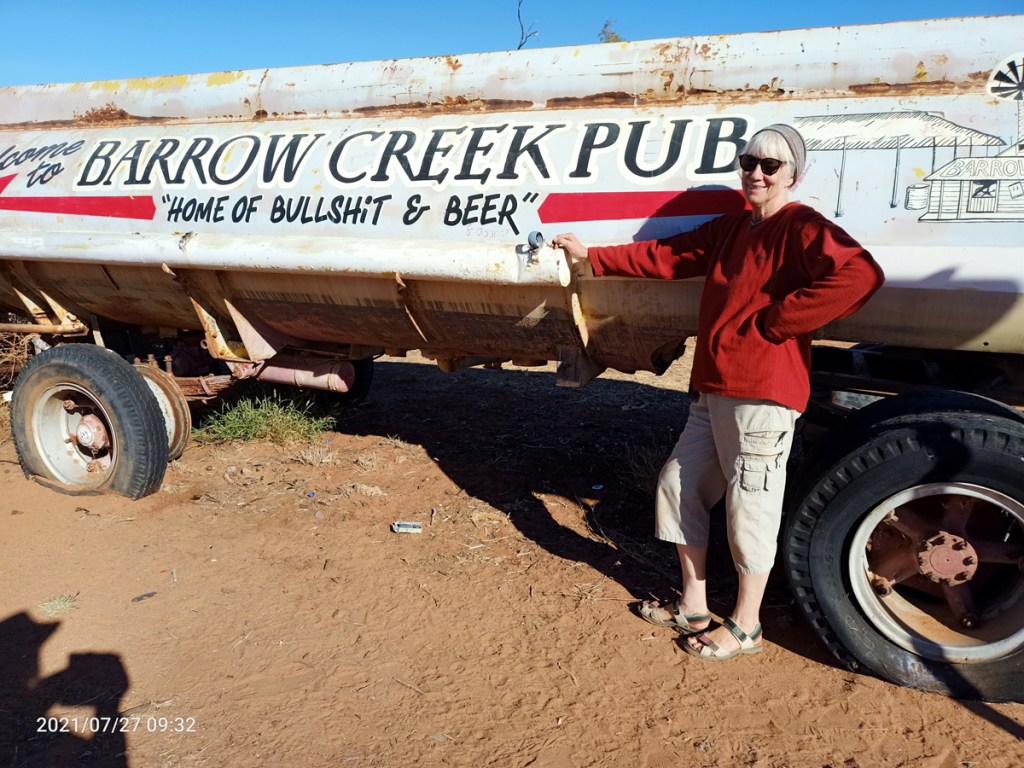 Barrow Creek: “Barrow Creek is a very small town, with a current population of 11, in the southern Northern Territory of Australia. It is located on the Stuart Highway, about 280 km north of Alice Springs, about halfway from there to Tennant Creek. The main feature of the town is the roadhouse/hotel” We stopped here and ‘refreshed’.