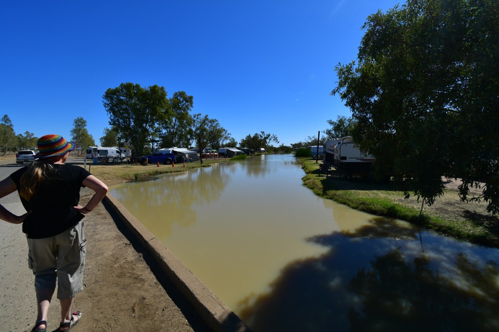 Breakfast in Bourke at Diggers on Darling – Cunnamulla caravan park by 4 pm watching the flick – White Tiger. The Cunnamulla Caravan Park is one of the really good ones. We needed to do laundry, charge up stuff, take showers… There is a river to view and walks to do which we did. We stayed two nights.