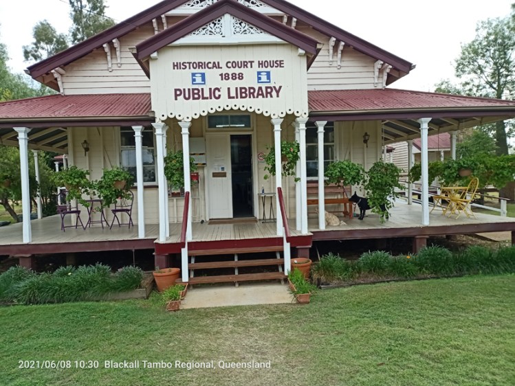 Two degrees Celsius this morning – left Cunnamulla camp site at 9 am – stopped at Wyandra for coffee – drove through Charleville – lunch – walked through old pub Camping 45 Ks north of Augathella 70Ks south of Tambo. Tambo is a town with lots of buildings. We stopped at the library and had a long tour and talk of the town from the local Librarian.