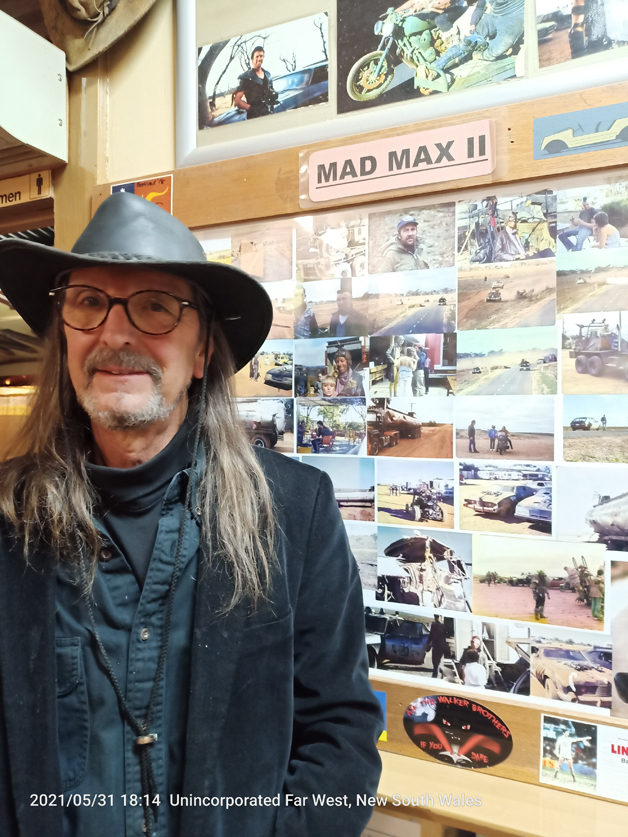 @ Penrose Caravan Park, a very good caravan park with a lot of spaces. We booked a powered site for three nights @$35/night, which is a bit high and we will do (hopefully) a lot of free sites as 90 days at this price will mean we can only afford a block of tofu to live on per week. Worried about eating tofu we ate the first night at the Silverton Hotel pub I had a very tasty veggie lasagne (rare for me due to the high carbs and I had high blood sugars for the next two days – but worth the change in diet). Narda was happy with the road-kill version of lasagne. A lot of films and commercials are filmed in the Silverton area such as Razorback, Wake in Fright, The Slim Dusty Movie, Mission Impossible II, The Adventures of Priscilla, Queen of the Desert. The first stop for any Mad Max tourist should of course be the Silverton Hotel. There is a wealth of history surrounding the hotel, and inside you will find pictures from Mad Max 2, and many of the other productions that have been done out there over the years. The road out past Silverton will also take you to the Mundi Mundi plain, where much of the opening of the film was shot. I tried out for the Mad Max films but there was no one to sign me up, to my temporary dismay.