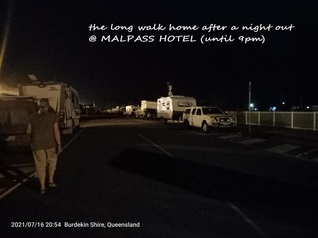 The Prairie Hotel is a free/donation appreciated campsite located on the Flinders Highway (Savage Street) in the small town of Prairie about 43km east of Hughenden in the Flinders Region of Northwest Queensland. The hotel is an authentic Aussie hotel providing a free overnight campsite on its grounds and is a must-see for its collection of stockmen’s hats and other memorabilia from the local area. It is a bit of a bogan (Bogan is Australian and New Zealand slang for a person whose speech, clothing, attitude, and behaviour are considered unrefined or unsophisticated) sort of place. We had planned to eat dinner there. The publican said dinner was steak and veg. I said what was there for vegetarians? He said ‘veg’. We ate in our caravan.