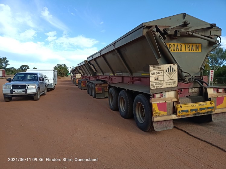 I have a fascination with the road trains; many with four-carriages. Signs on the highway say they are up to 53.5 metres – that is 175.5 feet. Stand the truck on its end and about a fifteen-story building.