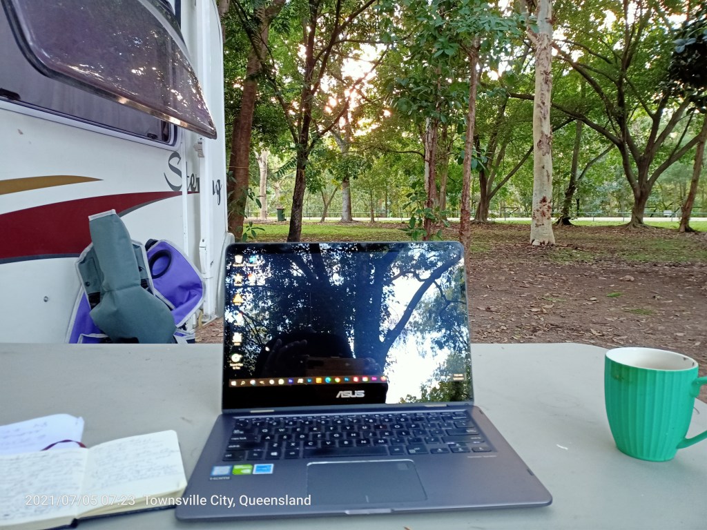 This was one of if not my favorite spot. We were there for six days. One of the ‘standards’ was this generation whatever it is for people in their 30s who would spend most of the day walking around the park in his boxer shorts and nothing else talking on his phone. I think he was working from home (well in this case from the caravan park) and he was always talking business. He seemed like a friendly fellow – wish I had gotten a photo of him – with no self-consciousness. He had one of those vans that people call ‘ Whizz Bangers ‘ next to us.