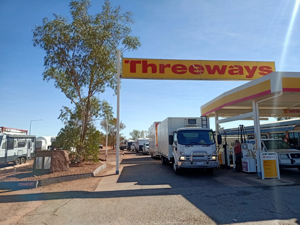 We left Barkly Homestead early and got over the border and to Tennant Creek stopping at the Three Way Roadhouse. Three Ways is a roadhouse located at the junction of the Stuart and Barkly Highways, 25 kilometers north of Tennant Creek. Diesel fuel was $2.04 per litre – the highest on this trip. For comparison it is about $1.35 in Adelaide. We filled up not knowing if there would be more available between Tennant Creek and Alice Springs 508 KM away. One full tank gets us abut 450 Ks and having run out back Charters Towers toward the beginning of our trip we were a bit insecure. ‘Spoiler alert’… we didn’t run of fuel getting to Alice.