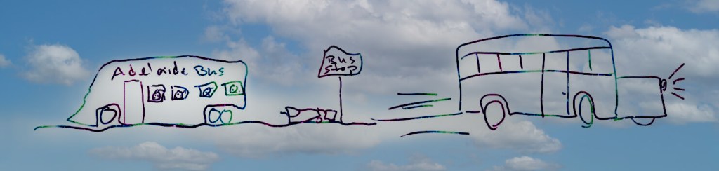 Narda’s drawing bus with our stuff on the sidewalk – on the right – my bus is on the left…our first time using the pen tool on this laptop…using Adobe ‘sky replacement’ tool for the background – my favourite tool – meaning on a cloudy day I can cheer it up with Adobe.