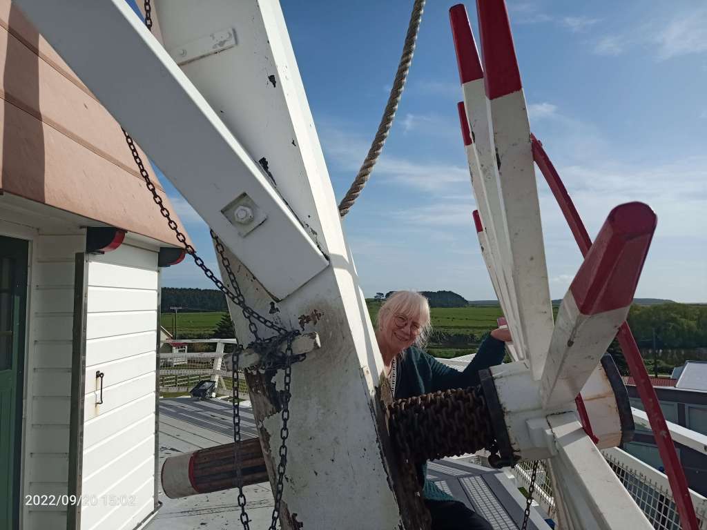 Narda starting the windmill on a bit of a windy dayThe windmill in Foxton, in case you thought we had skittled back to the Netherlands.