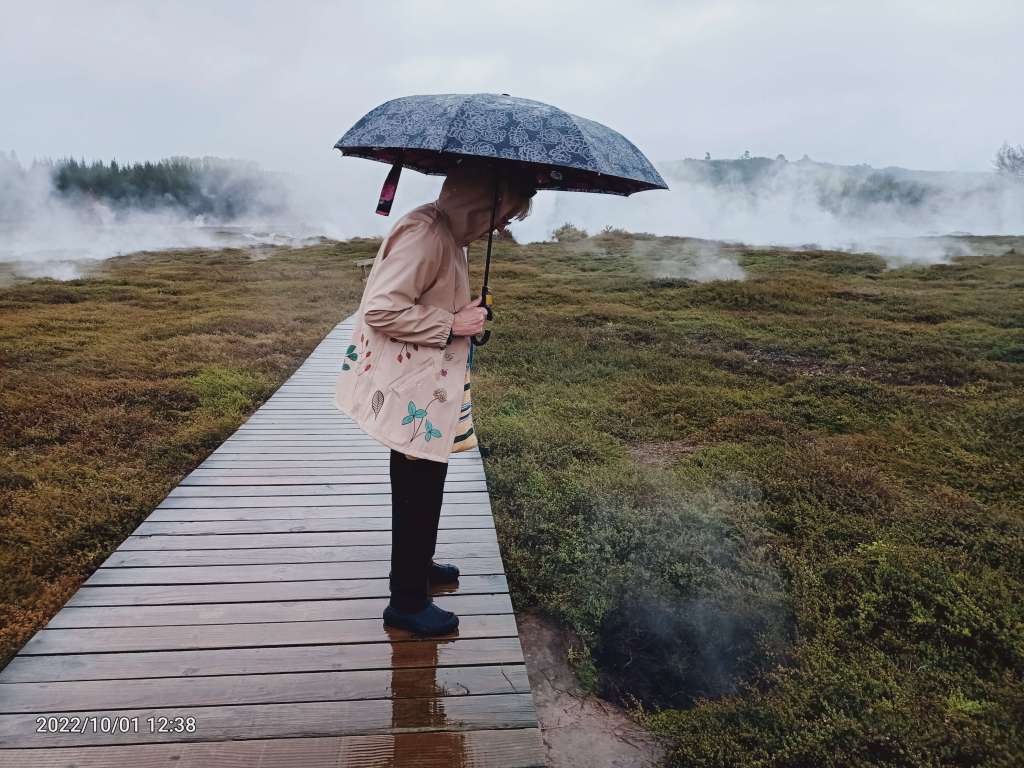 Tourists were we. First a tour of “Craters of the moon”. A decent walk through a park with many examples of funicular, which are funnels of hot steam rising up from the hot interior of the earth. It was nice, we were well set up for the constant rain: brollies and rain jackets.