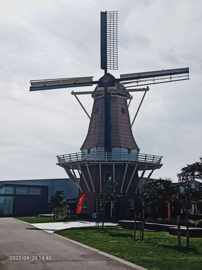 [‘De Molen in Foxton is a full-size replica of a Dutch windmill, completed and opened in 2003. Two Dutch immigrants, Jan Langen and Cor Slobbe, saw their dream realised that year. This working windmill makes stone-ground flour, available for purchase inside the mill’s souvenir shop. Visitors can also view the mechanical workings of the mill, which are an example of traditional Dutch 17th Century craftsmanship.’]