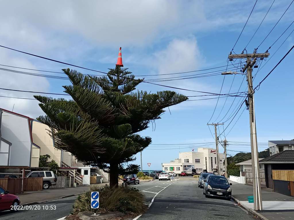 New Zealand street humour – witch’s cap on a tree top – note: we did not need to use Photoshop ‘Sky replacement’ tool – a perfect day