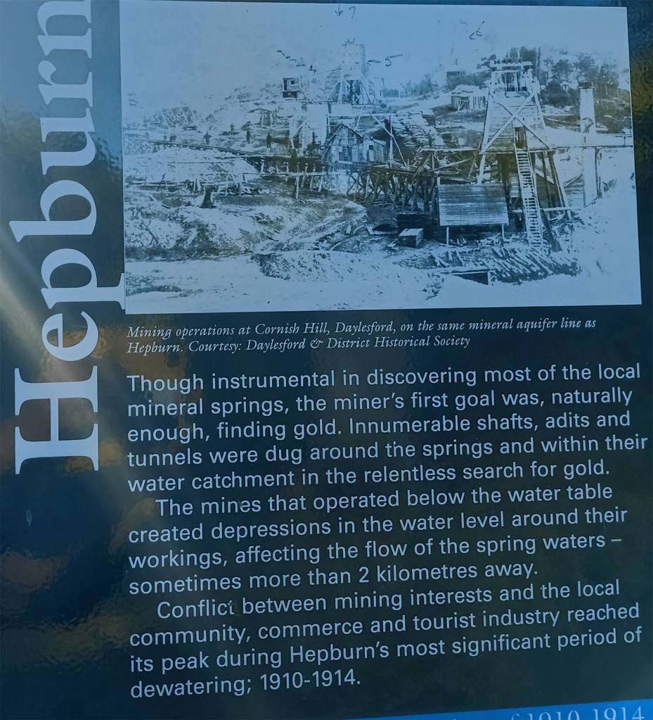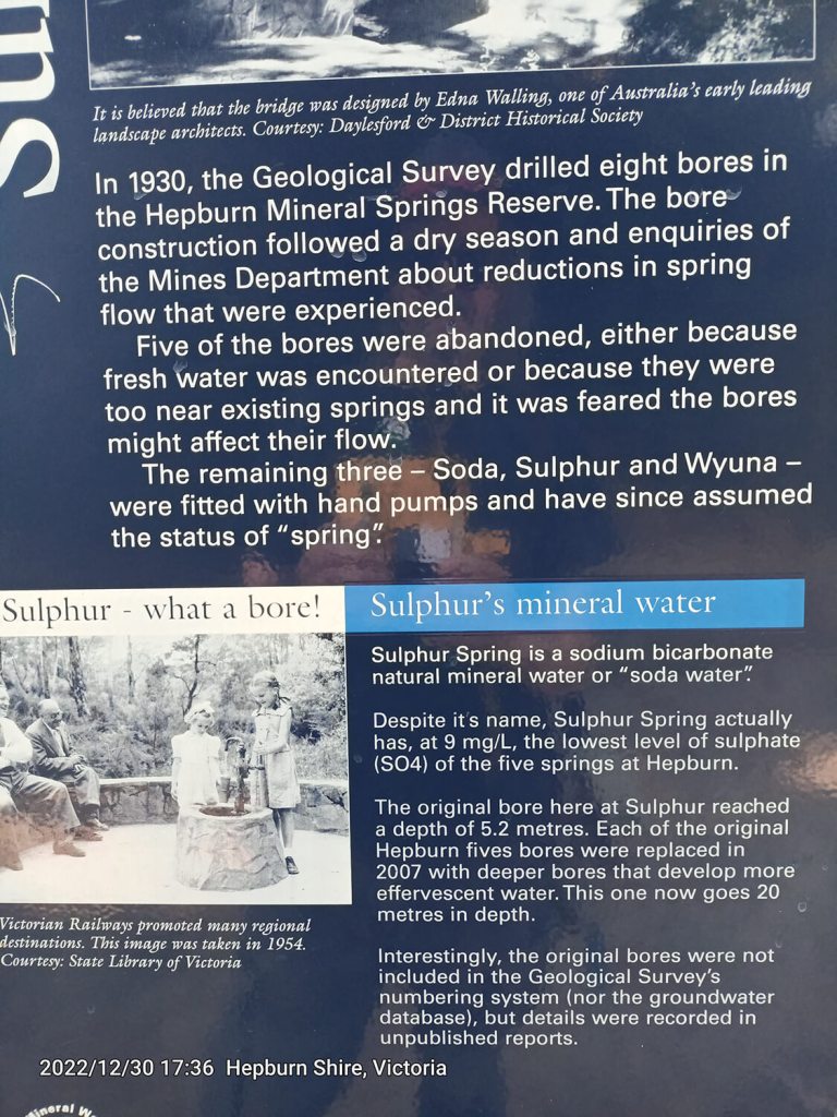 “The first mineral spring found in the area was by Captain John S. Hepburn. He named this spring, near the Hepburn Pavilion, which you can visit at Hepburn Springs Reserve. It is a short walk from Hepburn Bathhouse and Spa, where you can still bathe in the precious source. Following Hepburn‘s discovery, mining commenced in the Argyle Gully Spring Creek Area, and the Soda, Sulphur and Wyuna Springs were revealed, followed later by Liberty, Golden and Argyle Mineral Springs. But the miners didn’t care for the springs, the gold fever had taken hold, and they were willing to demolish everything within their path. We owe a debt of gratitude to Swiss Italian migrants Dr Severino and Dr Rosetti who recognised the significance of these springs and rallied the support of their fellow countrymen (in the 1850s one-tenth of the population spoke Italian). As it panned out, this unity established the above-mentioned Hepburn Springs Reserve in 1865, the first of its kind in Victoria. Since this time, it has become a meeting place to ‘take in the waters’ and experience the benefits of calcium, silica, magnesium and an abundance of other minerals.” A Wikipedia cut and pasted job.