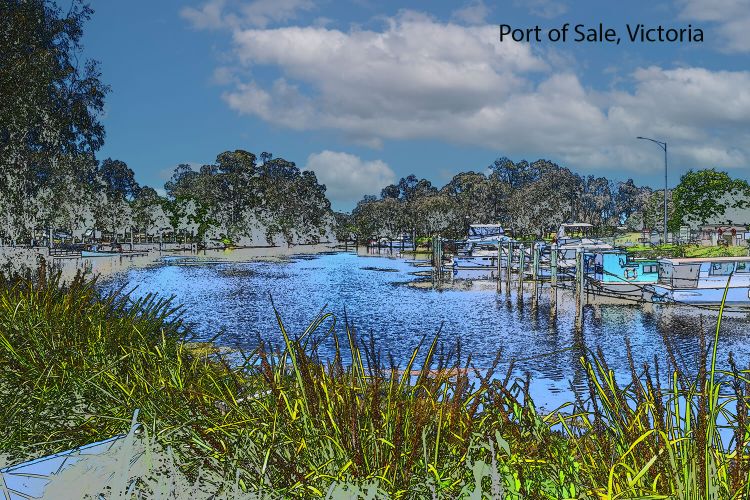 Next morning felt much better and we headed off again. This time I was less freaked out by the steep terrain; we filled up with diesel, and then on to Sale. I had a toasted bacon and egg roll, and Terrell had a quiche in the Sale shopping centre, which was open for business on a Sunday morning (unlike Adelaide which stays closed until 11 am). Sale has changed its name to Port of Sale, with a new canal developed providing a marina, attractive gardens, and an arts complex for the town. Really nice.