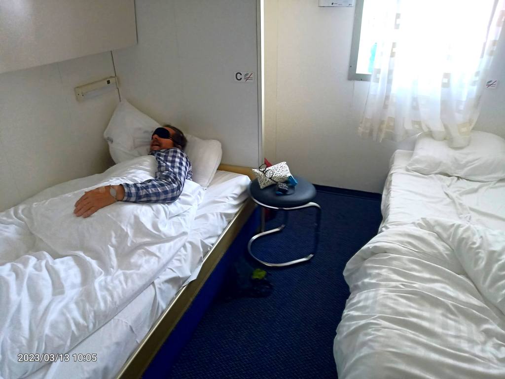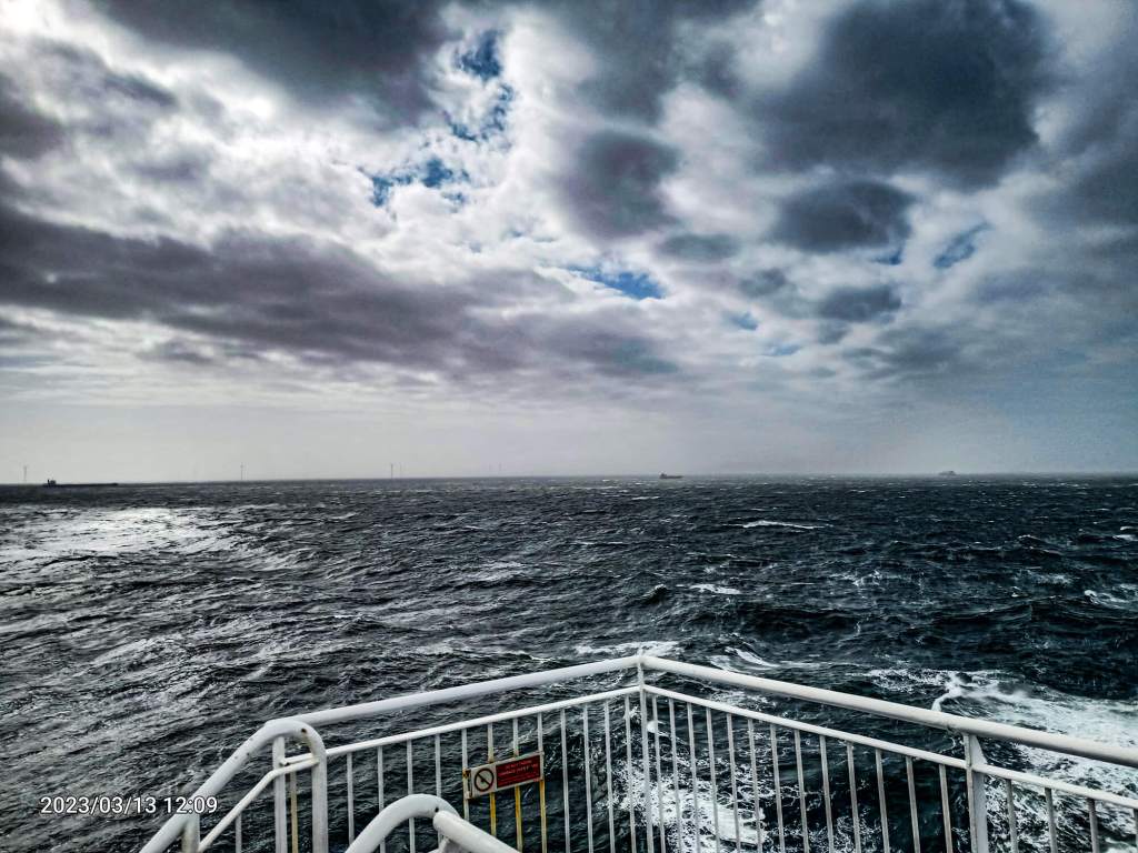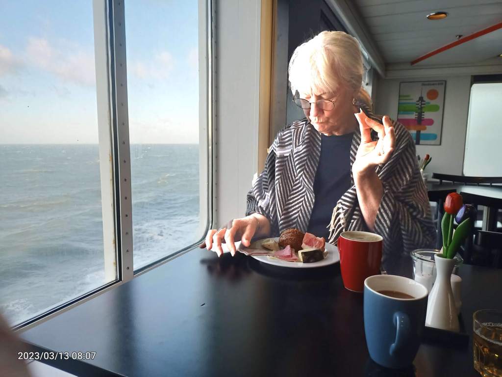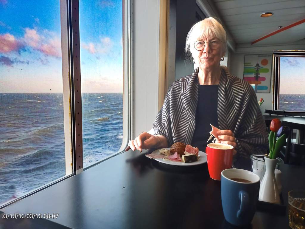 We both love cruises, even if they are this short – 17-hours, though a lot longer than taking a ten-minute ferry across the Murray River back in Adelaide. Longer than the three-hour ferry we recently took in New Zealand. It was a great ride. We were on the eleventh floor – that is how big this boat is. The food was really top stuff. I don’t remember eating so much at one time. We got to repeat our gluttony fun the following morning at brekkie. Sleeping was OK for a while – but we were both wide awake at one am as the sea was getting a bit choppy. We took a sleeping pill and slept through until breakfast.