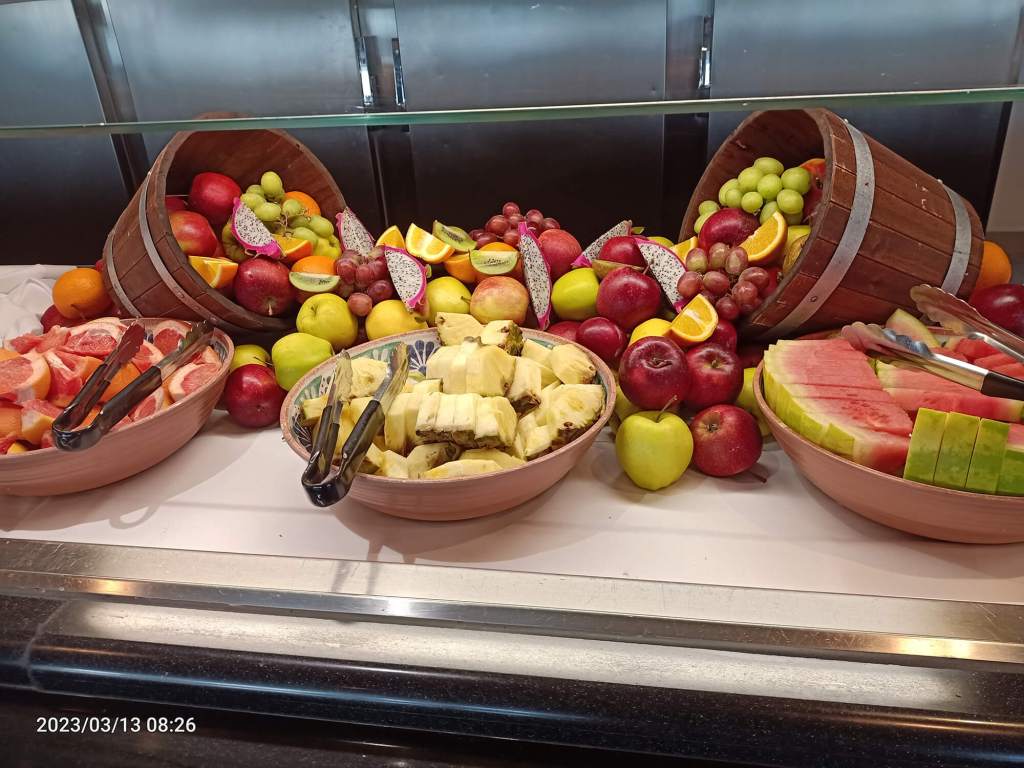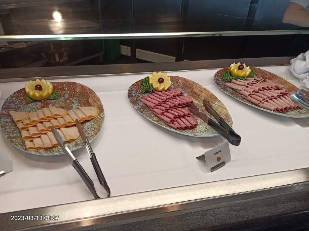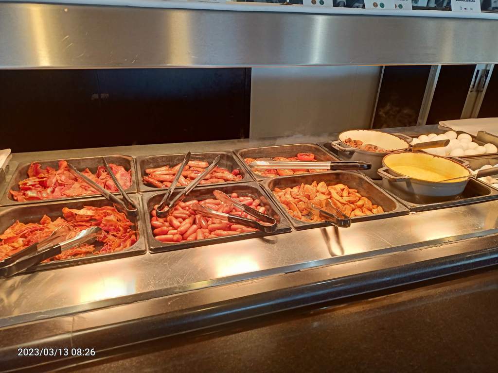 Departure was delayed by 4 hours, as the ship waited for 300 soccer fans from the Netherlands and Germany to board. We were allowed to board early so we got a good start on that buffet.