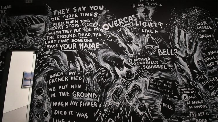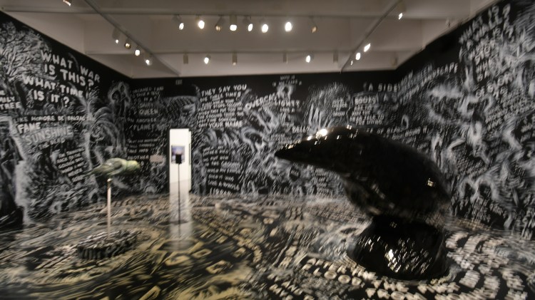 Below images are from Laurie Anderson. “Laurie Anderson is one of the leading multimedia artists of our time, and her innovative work in performance, music, technology, and visual art has profoundly influenced popular culture for more than forty years. In 2021, as part of The Weather—her largest US exhibition to date– the Hirshhorn invited Anderson to create a new work on site. Anderson worked ten-hour days at the Museum for more than two weeks to paint directly on the walls and floors of this large gallery, covering nearly every inch with stories, song lyrics, jokes and commentary on current event. Painting in a stream-of-consciousness manner without preparatory sketches, she created an enveloping and intensely personal installation that takes visitors on a journey through her mind. The installation’s title, Four Talks (2021), refers to the four sculptures—a raven, a parrot, a canoe, and a shelf—at its center, each accompanying by a pithy story or text passage. Monumentally scaled, conceptually rich and visually captivating, Four Talks, currently on long-term view on the second floor outer, represents a key achievement in Anderson’s career.” – from the museum’s webpage https://hirshhorn.si.edu/