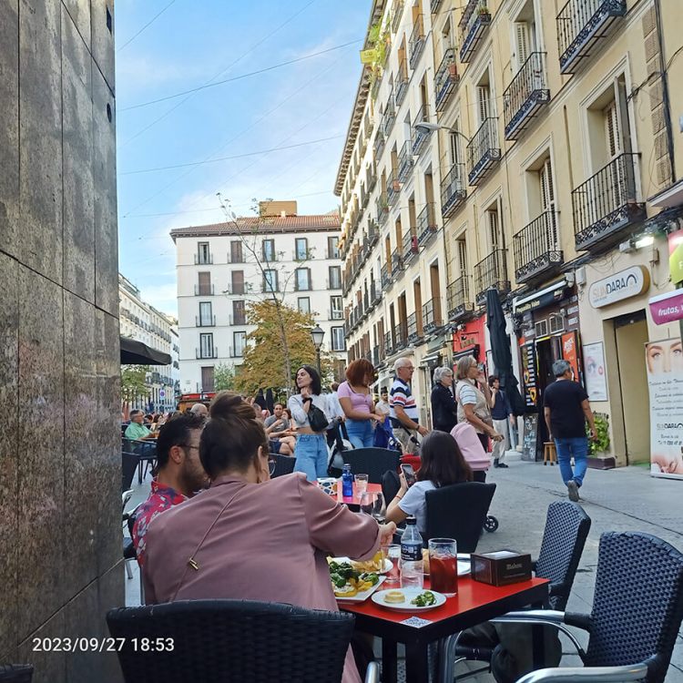 We stayed at apartamentos Juan Bravo, Juan Bravo, 58-60, Salamanca, 28006 Madrid https://www.apartamentos-jb.net/en/index.html In the Salamanca district, which seemed like a fashionable space. People eating on the footpath – or outdoors which looked like they were eating on the footpath.