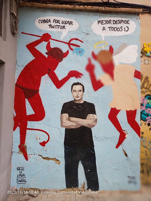 Speaking of Twitter – I think the Spaniards dislike Musk – saw this graffiti on a wall in Valencia recently.
