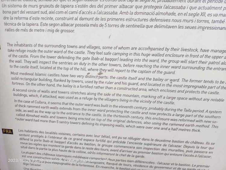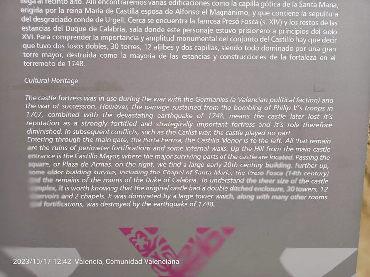 (from the internet) https://visit-cullera.es/ Built in this strategic location in the 9th century, the fortification was tasked with monitoring and protecting the coast and key roads.The curtain walls are punctuated with towers that are still standing today, namely Torre de la Reina Mora, Torre Miranda, Torre del Racó de San Antonio, Torre Desmochada and Torre Octogonal.