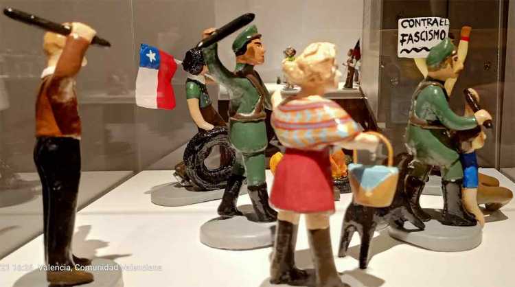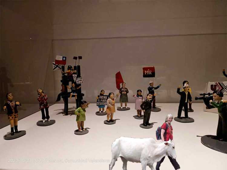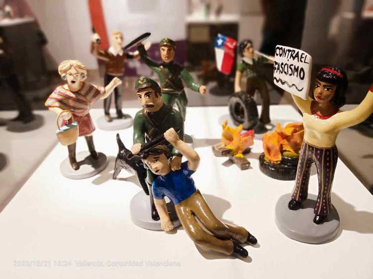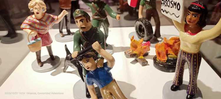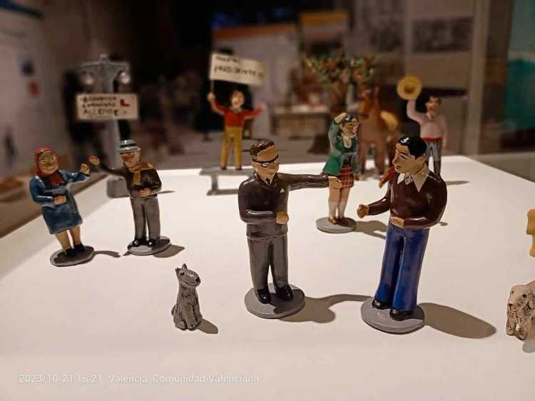 A display of small ceramic figures explaining the civil war in Spain, which broke out in 1936, resulting in 500,000 deaths. The cause was ideological differences. A conservative military (the reds) tried to overthrow the progressive government (the whites) of the popular front. After 3 years of bloody fighting general Franco took power and remained a brutal dictator until his death in 1975.