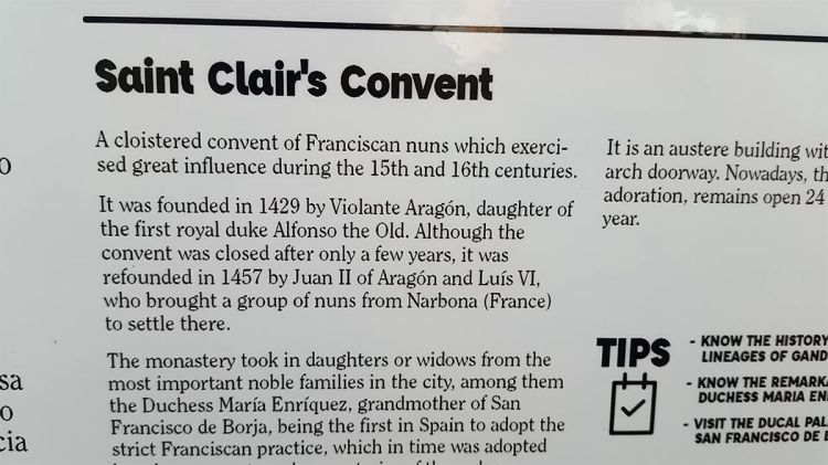 Gandai was a cool town. Take the C1 train there from Valenica North. We went here because it was sort of free, well, not exactly. We got a senior’s train pass which for 10 Euros we got eight trips anywhere within section A, B and C which was quite a way away. Everywhere we went was within section A, B. or C except for one time, not knowing better, we got off in Xeraco which was in section-D. We had consultations in broken languages, with understandably misconceptions of what to do, climbed over some gate thingy and managed to get off and back on without much to do and not paying the extra – because we are old tourists, and such things are easily forgiven as far as we are concerned. We explored this very old town, came across a very old convent, The Convent of Sant Clara from the 1400s