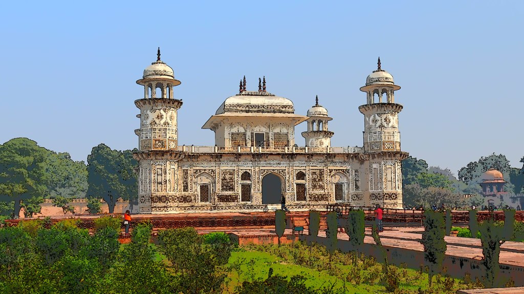 [Tomb of I’timād-ud-Daulah (I’timād-ud-Daulah Maqbara) is a Mughal mausoleum in the city of Agra in the Indian state of Uttar Pradesh. Often described as a “jewel box”, sometimes called the “Bachcha Taj” or the “Baby Taj“, the tomb of I’timād-ud-Daulah is often regarded as a draft of the Taj Mahal. (the internet)]