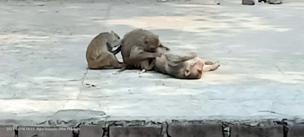 I kept a watch on the local monkey population. Someone at breakfast at our homestay had his smart phone ripped from his hand the day before – a monkey chewed on it and the man was able to get it back by giving a piece of fruit to the critter. another person said her glasses had been stolen – apparently, monkeys will steal glasses off of one’s face as they see their reflection. There are a lot of monkeys in our area, probably all over Agra. They will climb onto your porch and take things.