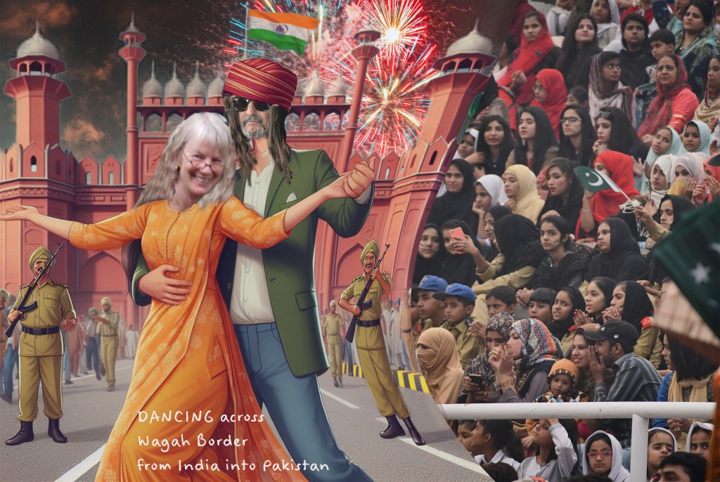 In the previous three times to Lahore we flew. Always a long way either through Dubai or KL. Having gone to the big nightly celebrations, one on the India side twice on the Pakistan side to see the place empty was a goal. The border opens at ten am and we were there in line. We would have been first, but I wanted a cup of coffee which put us behind a couple of other people. Going through was easy as. They checked our passports, put our bags through a scanner – I showed them my pacemaker saying I could not go through their bloody scanning device, though not exactly in those words and as usual no one wants to go near me after that. We got to their big mean looking fence and gate, they opened it, we took some photos, though I didn’t think in the moment to have a picture of Narda with one foot in India and one foot in Pakistan. We will do that on the way back which will be the next blog. They let us take photos of the gate and the guards and everyone seemed pleased with their lot in life, considering these two nuclear armed countries have a terrible past of killing each other – reading a book about that now, “Train to Pakistan” by Khushwant Singh. So many thousands killed one another in 1947 on both sides.